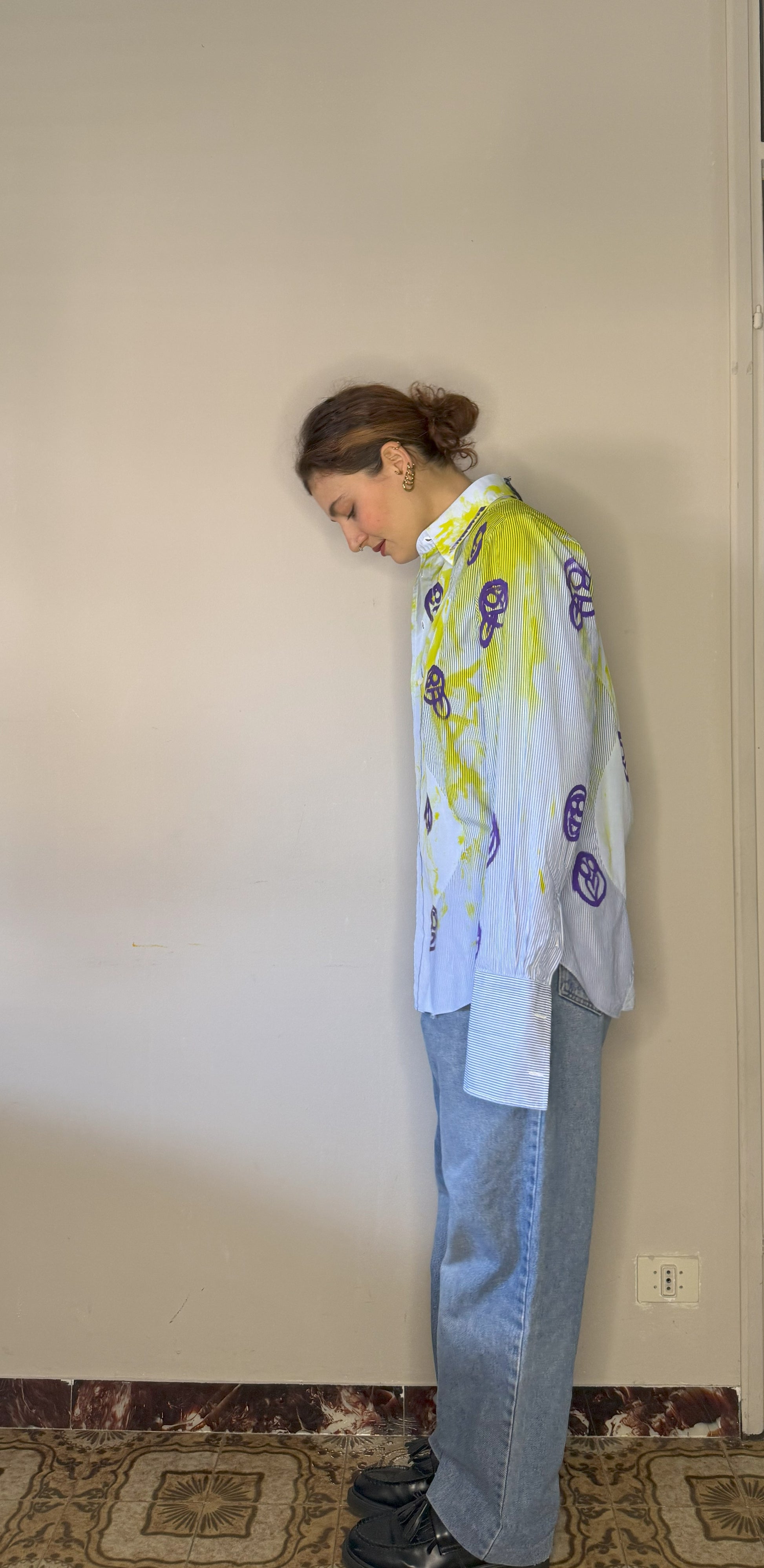Il tessuto azzurro viene poi attraversato da una grafica dipinta a mano con colori per tessuto. Un giallo acceso, quasi fluo, sembra colare dall’alto, toccando spalle, fronte, retro e fondo della camicia. Qua e là, appaiono delle piccole faccine viola, simbolo di Divergente.
