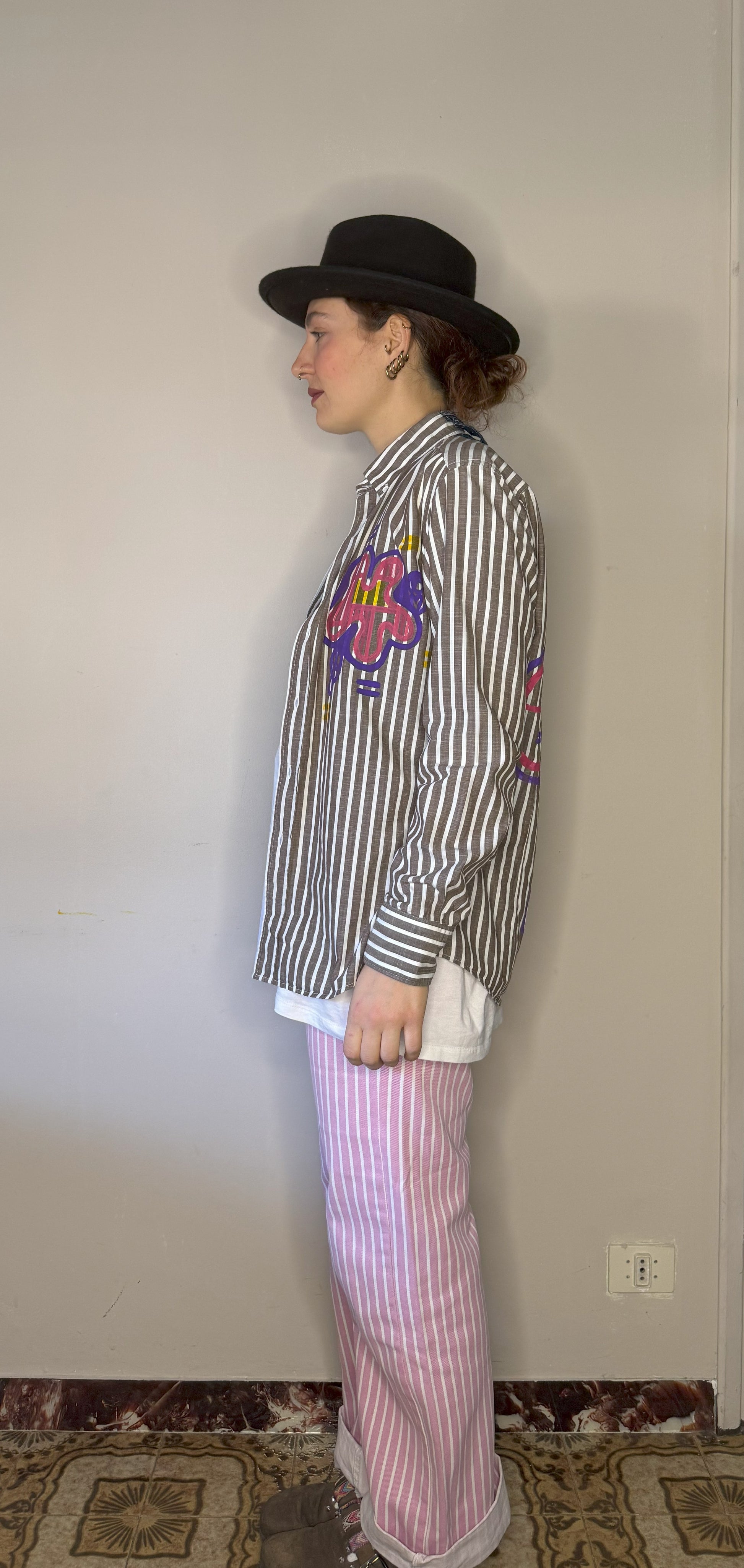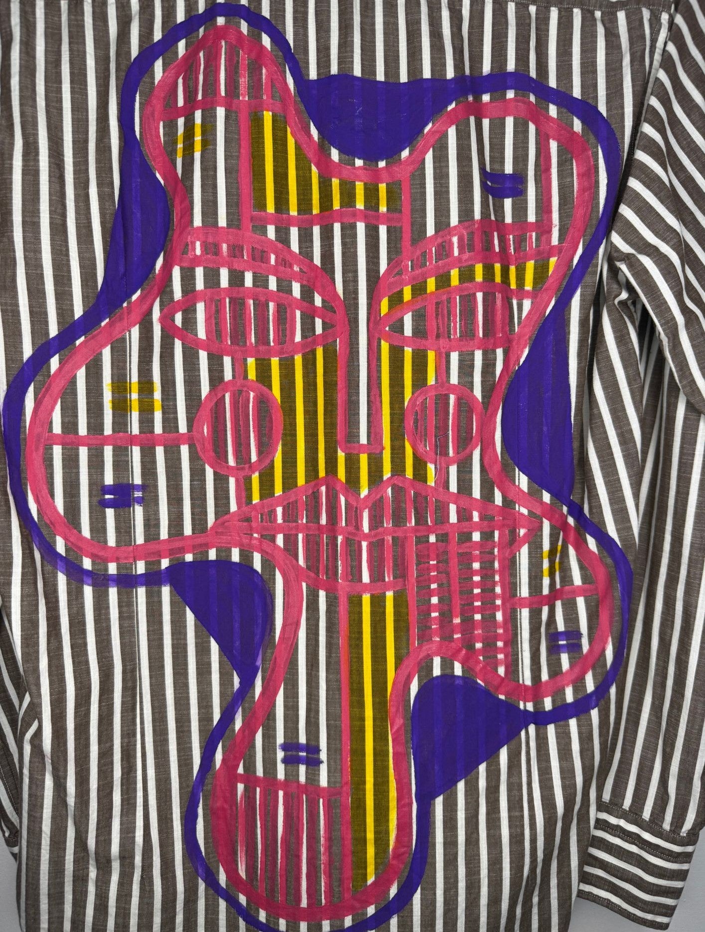 Le curve morbide della pittura si contrappongono alle linee dritte del tessuto a righe, in un gioco visivo che rende il capo più solare, dinamico e personale. I colori, rosa, viola e giallo, aggiungono vitalità senza stravolgere l’equilibrio di base.