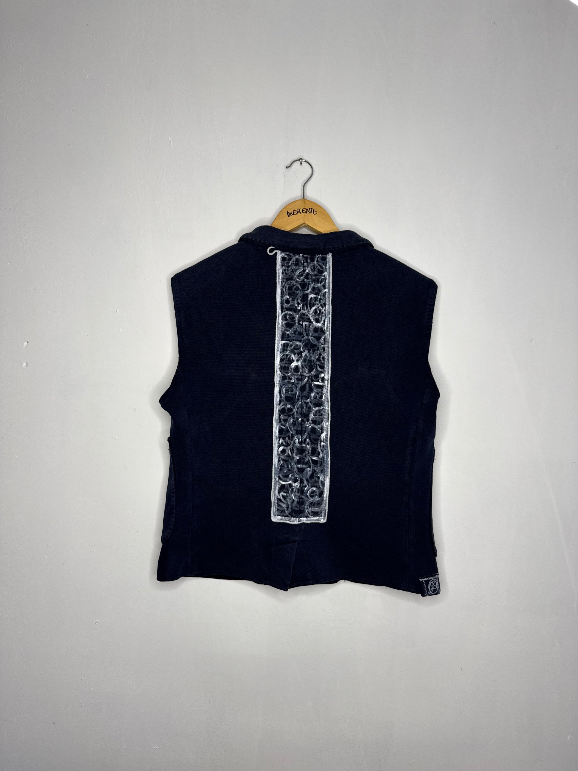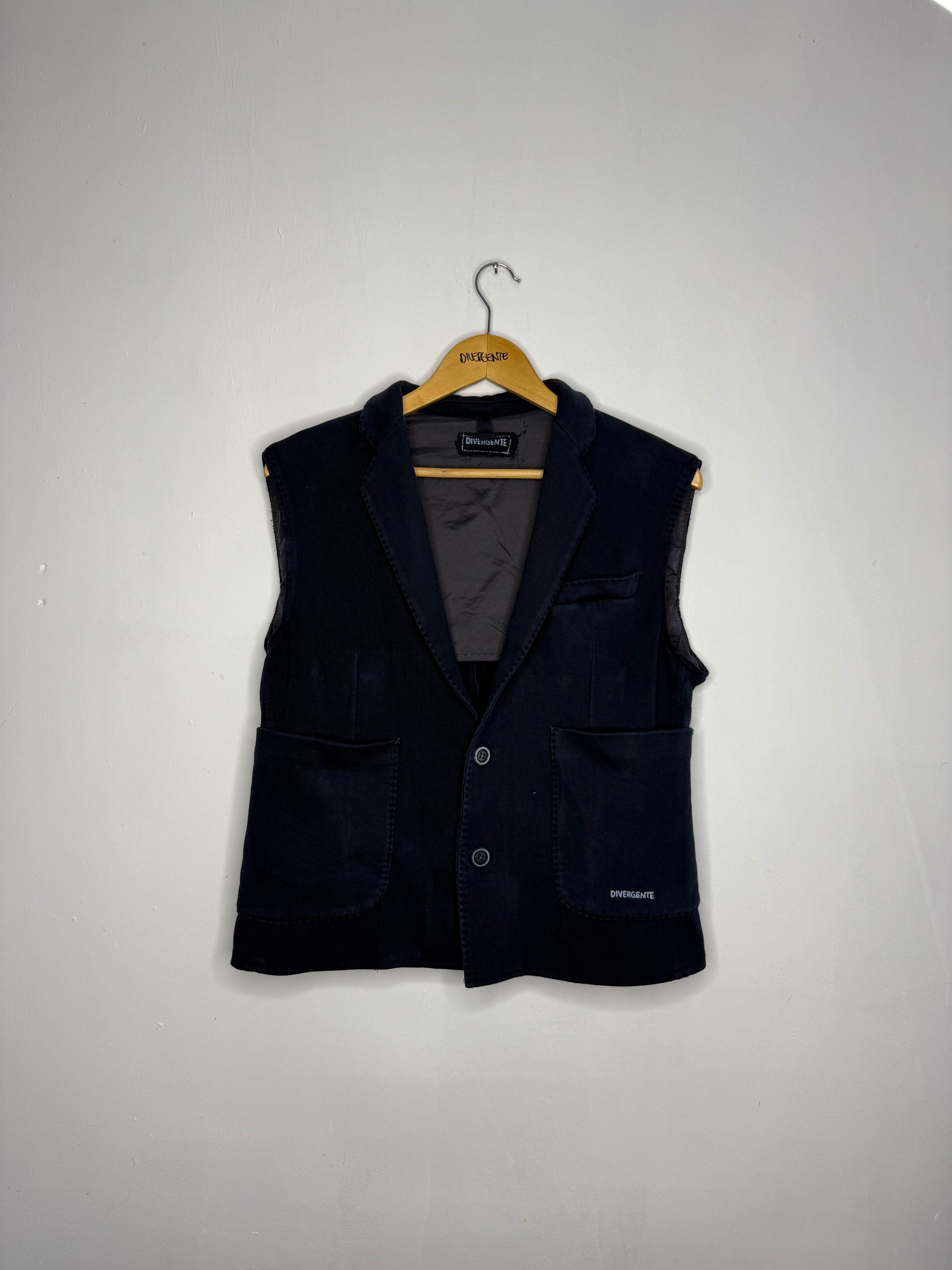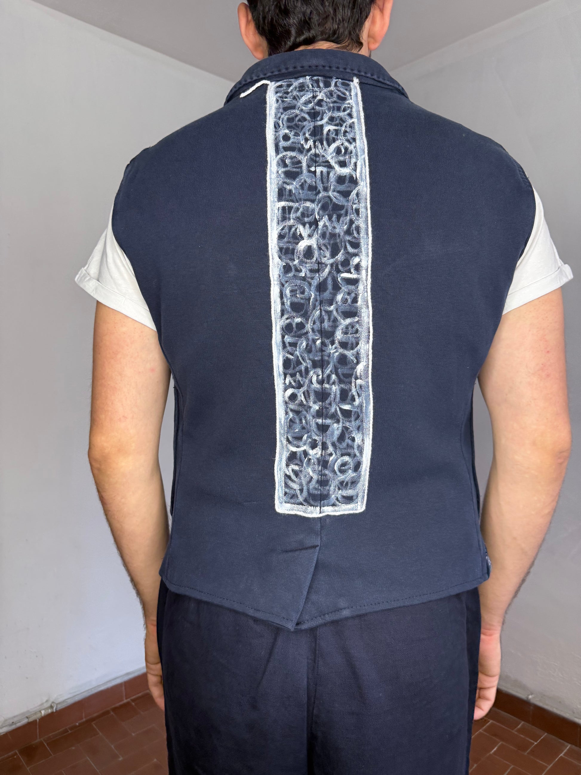 Gilet in tessuto felpato, nato da un classico blazer che perde le maniche e si accorcia leggermente per diventare più leggero e giovanile.
