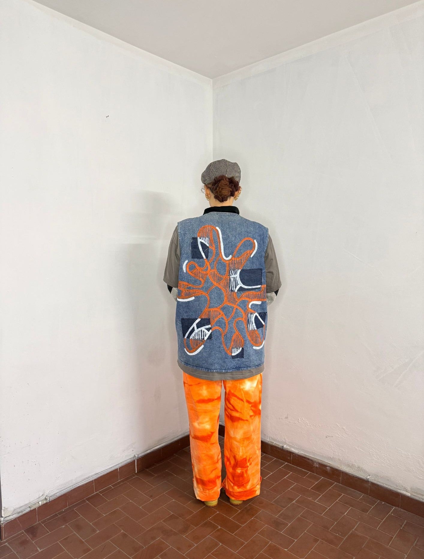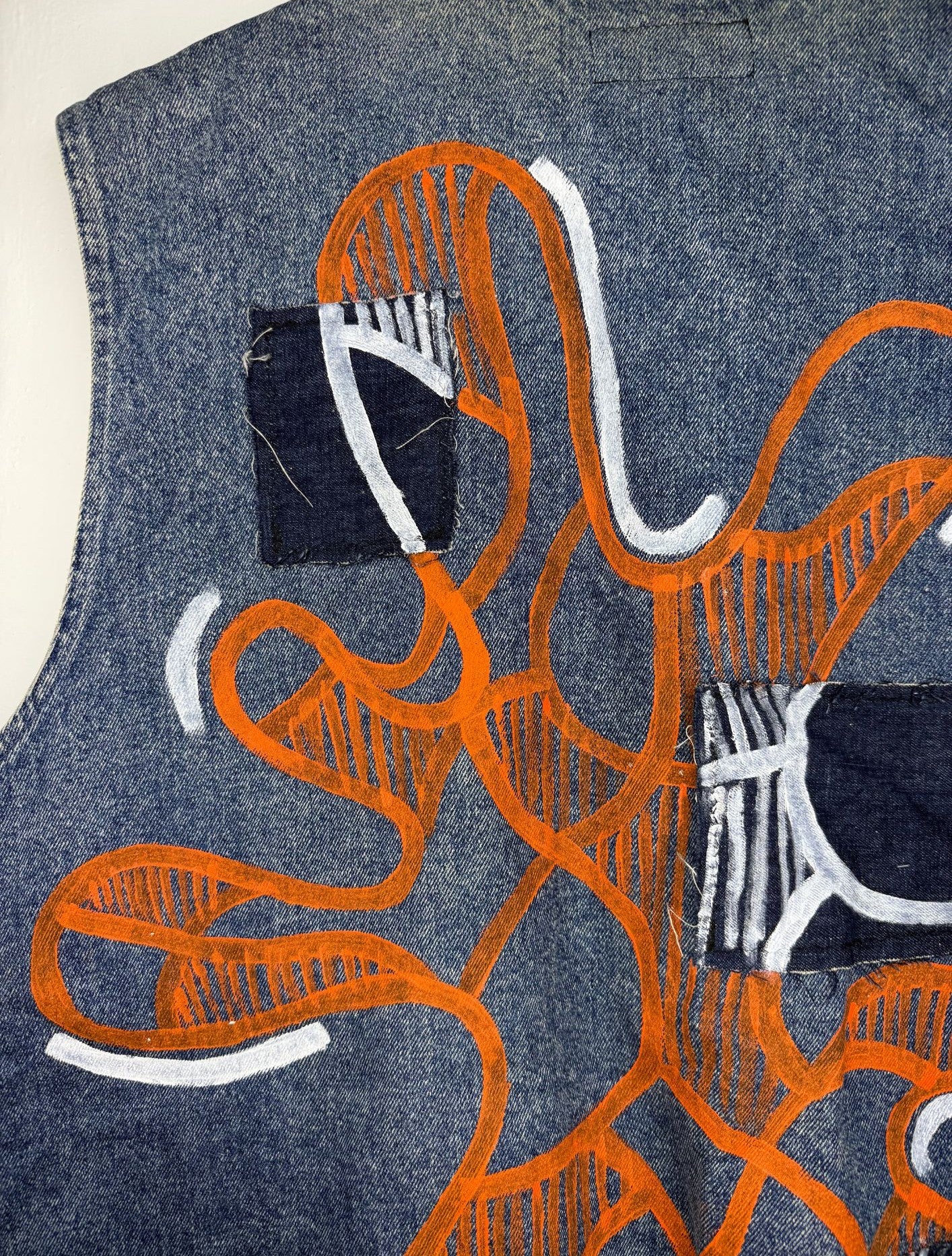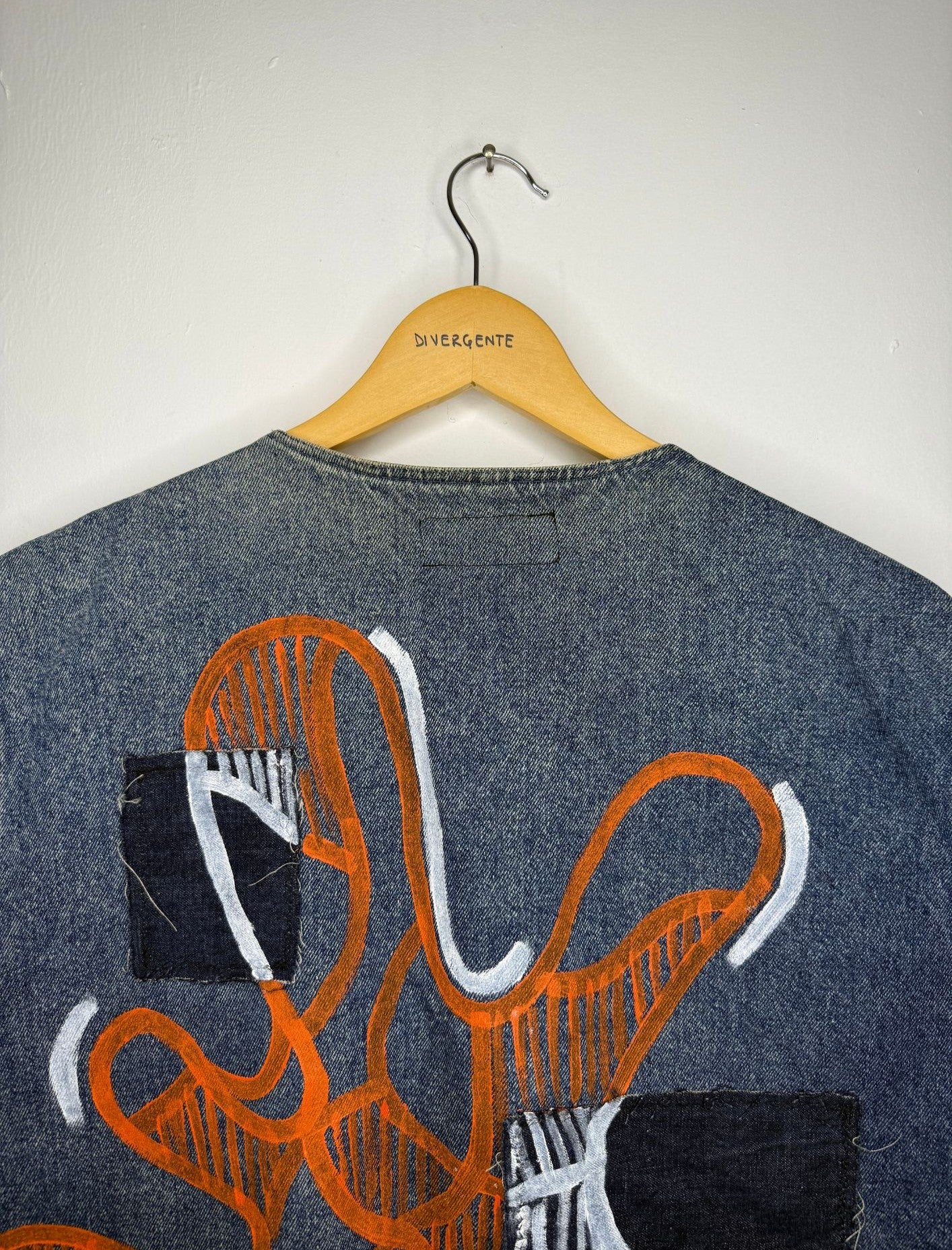Sul dorso prende forma una grande grafica tondeggiante dipinta a mano, al cui interno si sviluppa il motivo astratto tipico di Divergente. Per dare profondità e dinamismo alla composizione, sono state applicate toppe in denim più scuro, sopra le quali la pittura cambia tono: un arancione acceso sul tessuto base, che si trasforma in bianco quando attraversa le toppe.